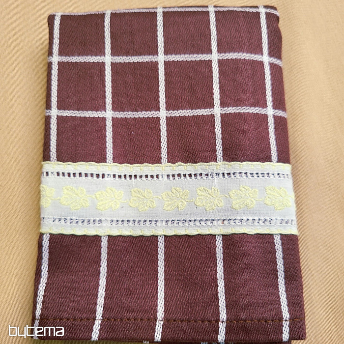Mehke bombažne kuhinjske krpe s karo vzorcem in rumeno obrobo z rumenimi listi. Čudovita in nežna dekoracija za vašo kuhinjo.