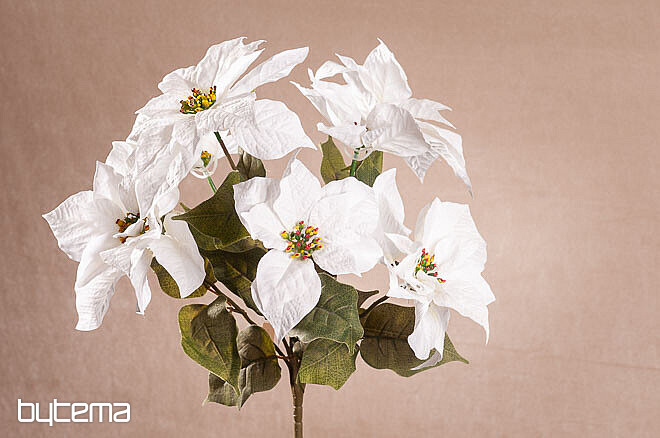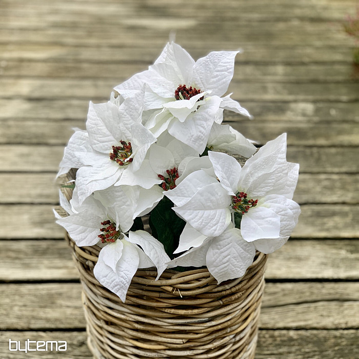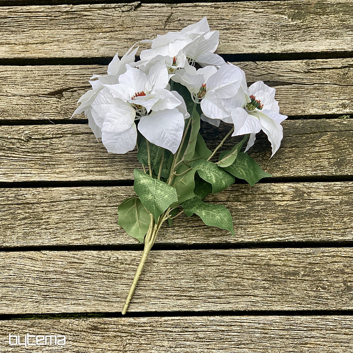Velik šopek rdečih rož v uspelem dizajnu. V bogatem šopku je sedem cvetov in veliko listov. Cvet izgleda zelo naravno in zaradi lepega videza bo impresivna dekoracija v božičnem času.