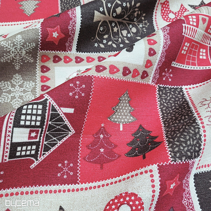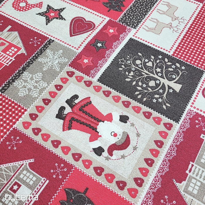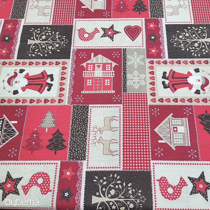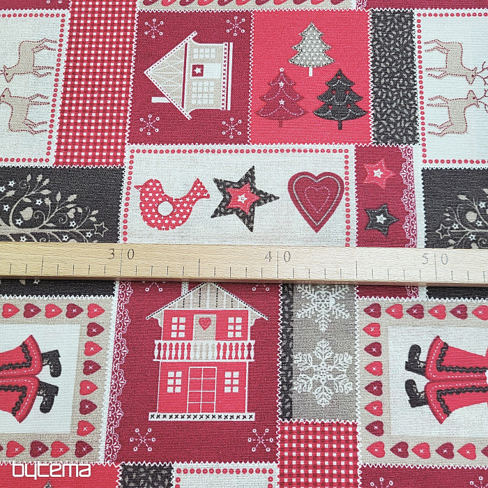 Dekorativna tkanina z božičnim patchwork dekorjem, primerna za notranjost v rustikalnem in podeželskem slogu.