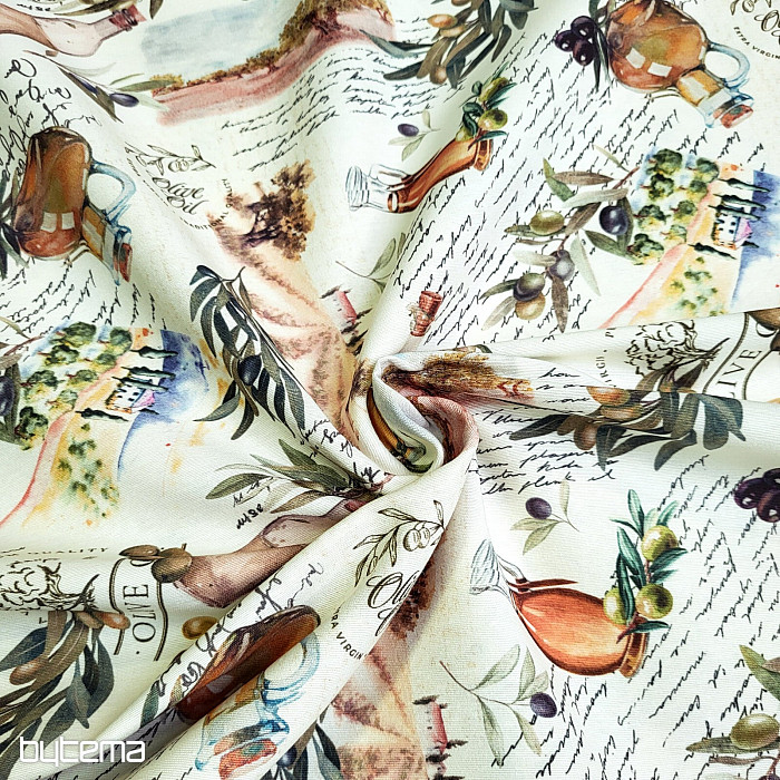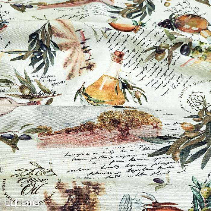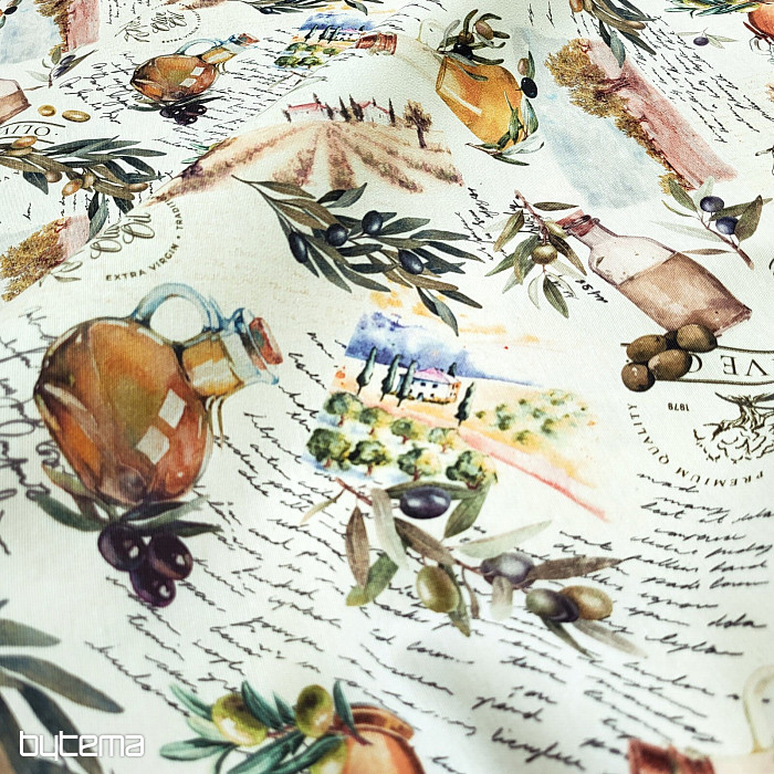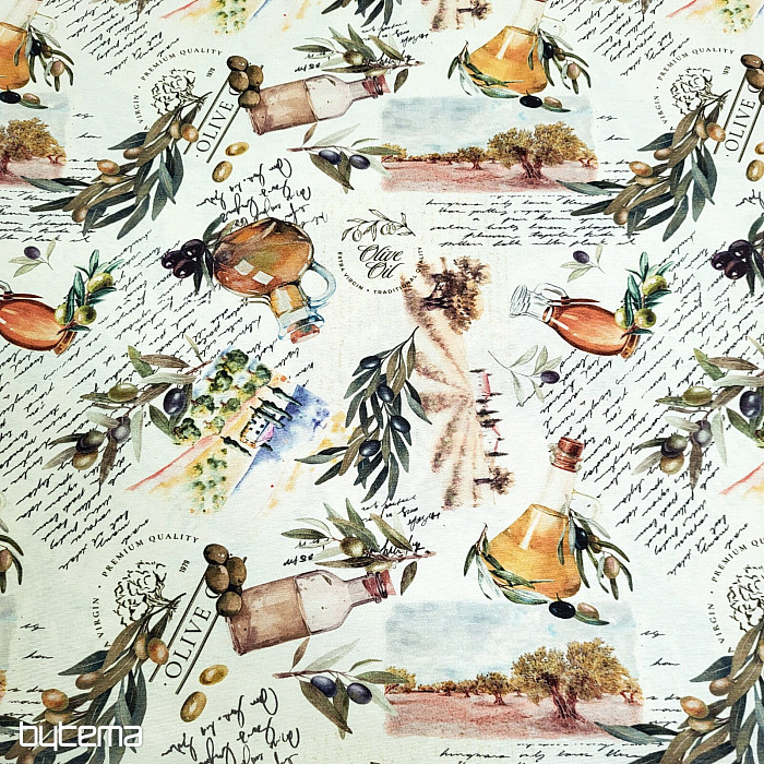 Dekorativna tkanina z motivom oljk ima svež, mediteranski videz in je primerna za kuhinjo, jedilnico ali poletne dekoracije.
