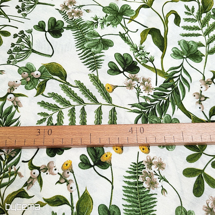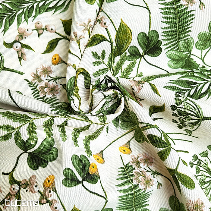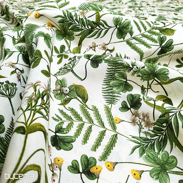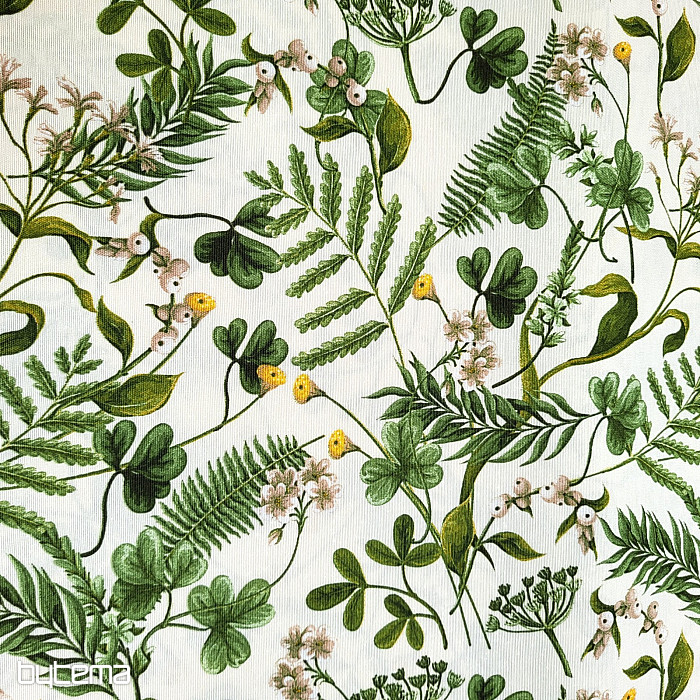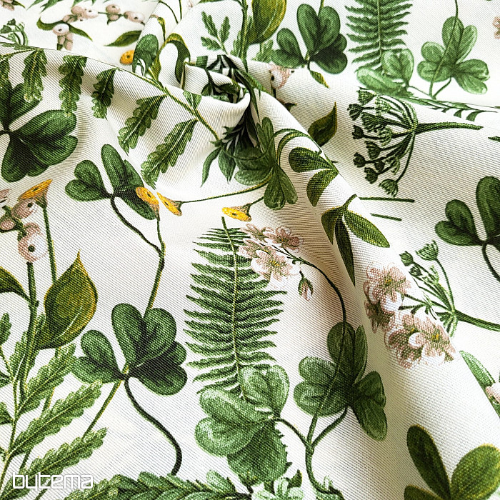 Dekorativna tkanina z divjo deteljo in travami v temno zeleni barvi.