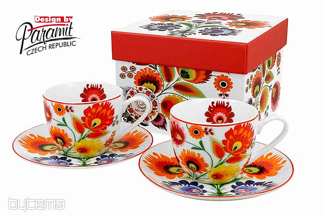 Dve skodelici in krožnika sta pakirani v lepi darilni škatli.