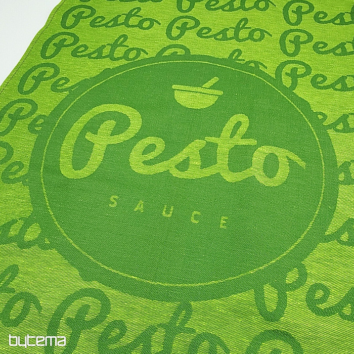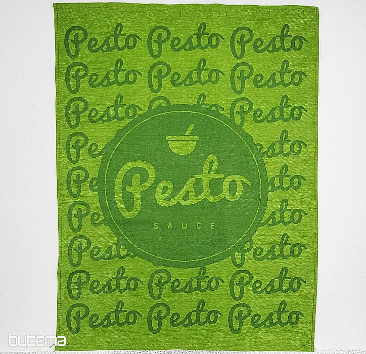 Čudovita zelena kuhinjska krpa z napisom PESTO. Lepo darilo za vse kuharje.