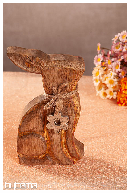 Okras za pomladne praznike. Zajček je visok 18 cm in je ročno izdelan iz mangovega lesa. Okoli vratu ima kovinsko rožo, ki simbolizira pomlad, ko vse začne cveteti.