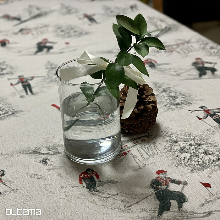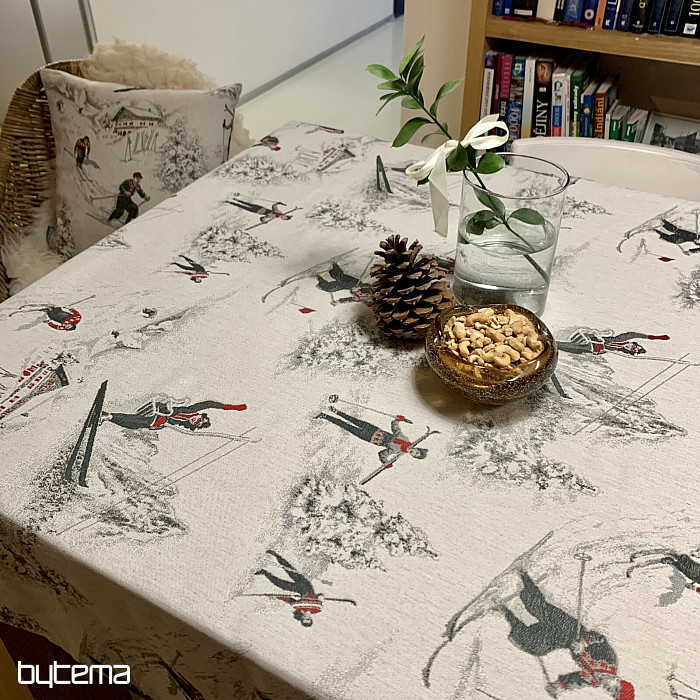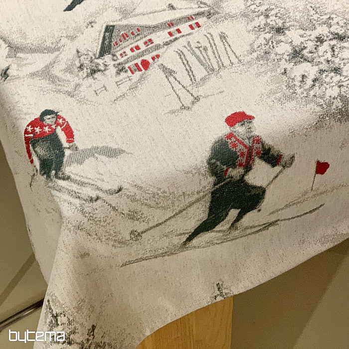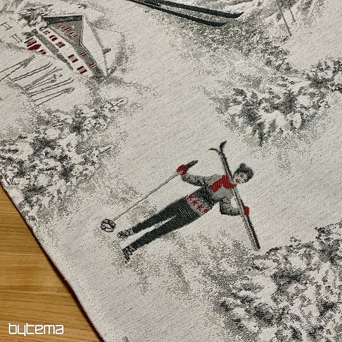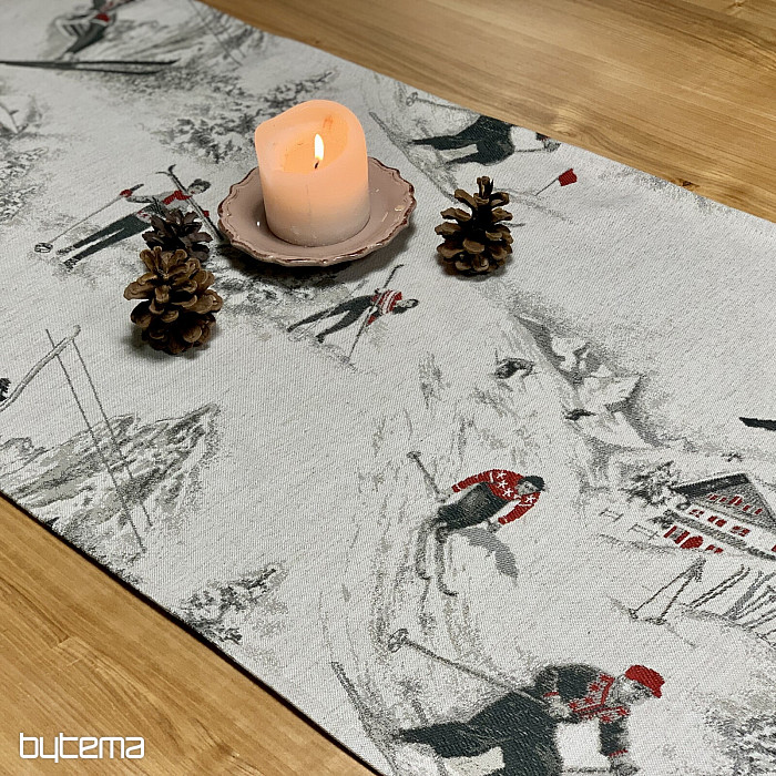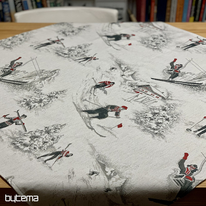 Zimsko smučanje in vse okoli njega je glavni motiv te razkošne tkanine. Lepo se poda na vsako mizo v planinskih kočah ali brunaricah.