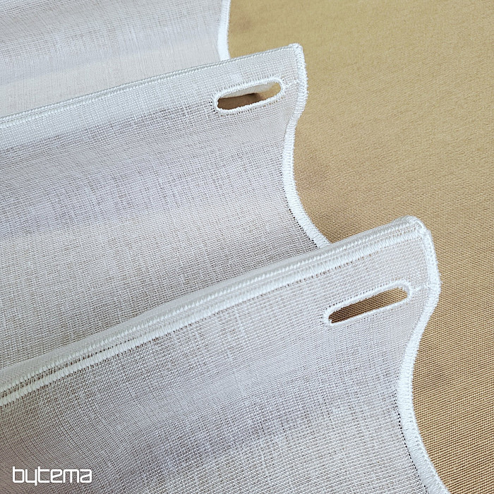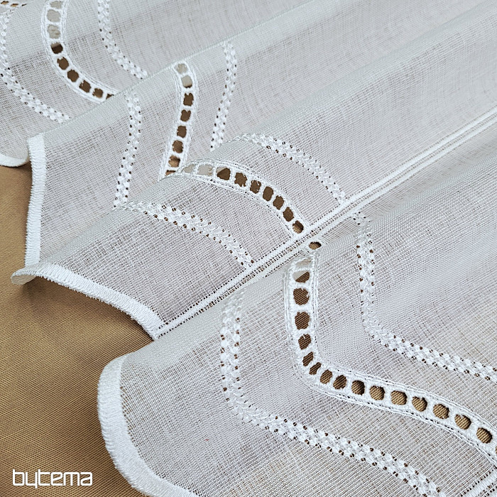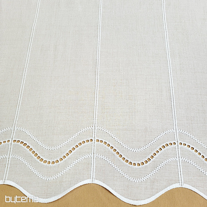 Moderna enostavna vezena zavesa za vitraž. Ni potrebno šivati, ker je rezano v vezenih linijah cca 15 cm. Material ima videz naravnega do mehkega platna.