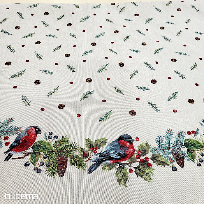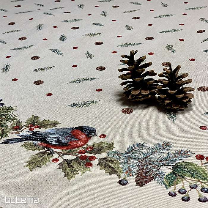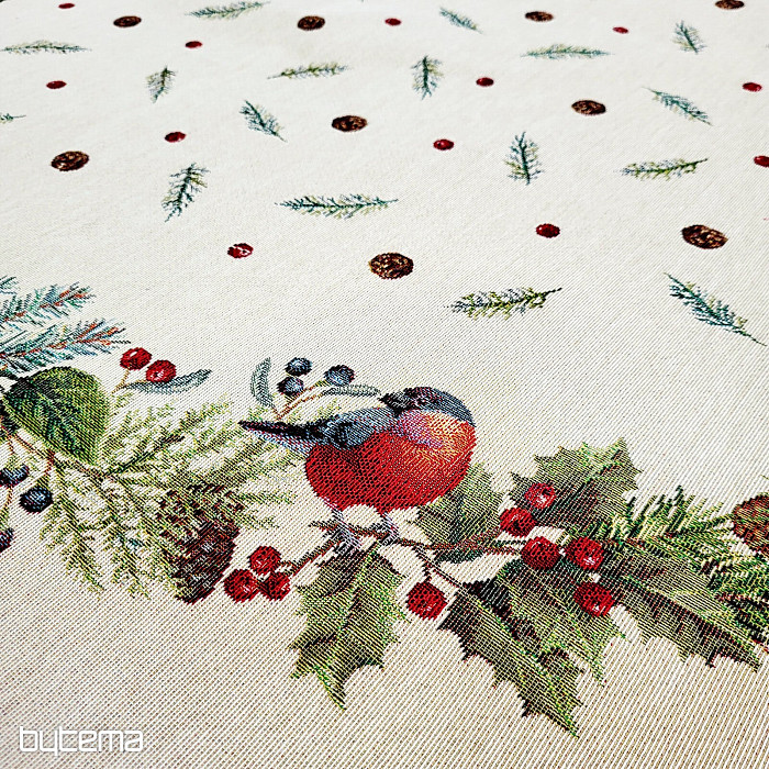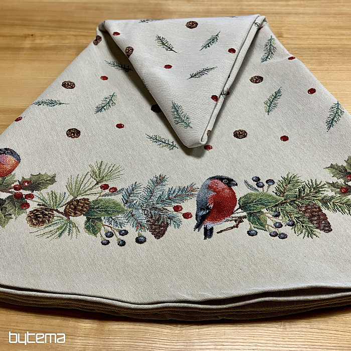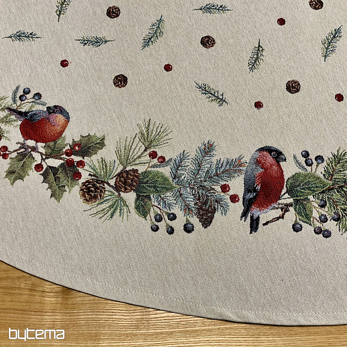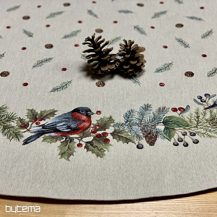 Okrogel božični prt iz tapiserijske tkanine z motivom zimske ptice - sneguljčka. Ne bojte se uporabiti tega prta kot okras za božični čas.