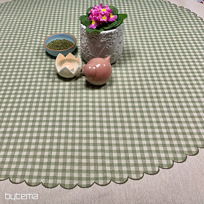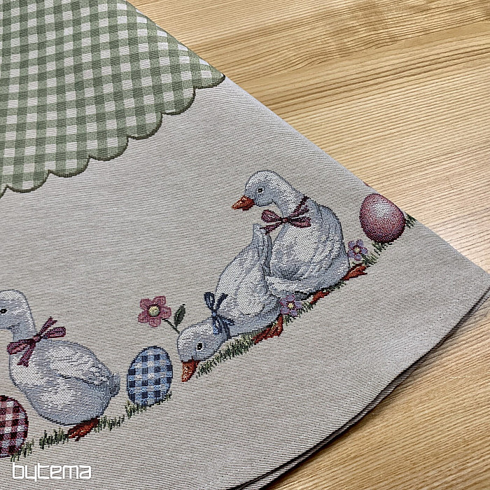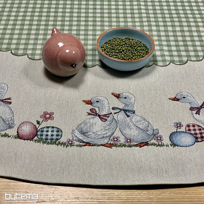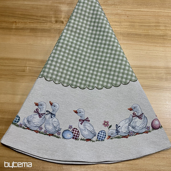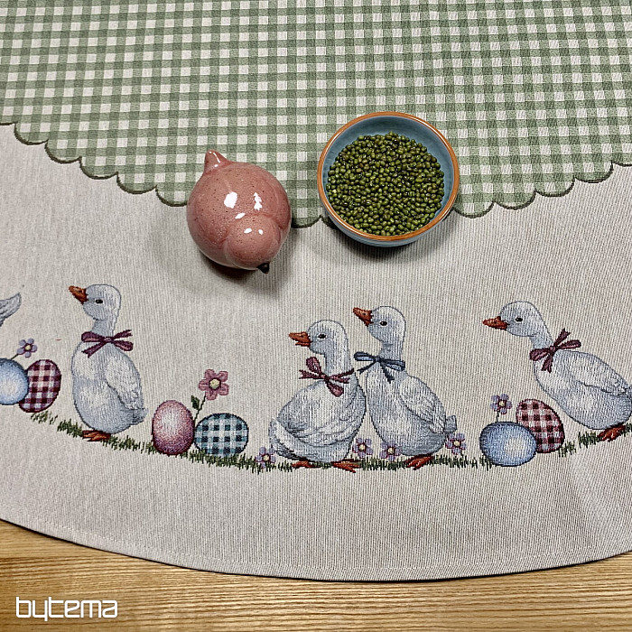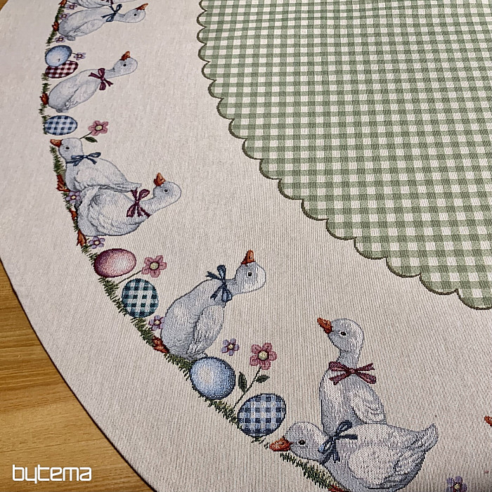 Velikonočni okrogel prt iz tapiserije z zelenim karo vzorcem in gosmi. Čudovita dekoracija za vašo okroglo mizo.