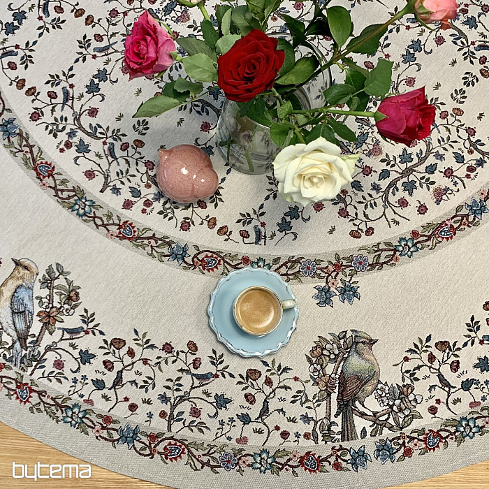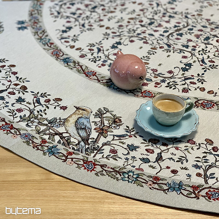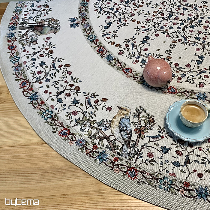 Čudovit okrogel prt iz trpežne tapiserije s pticami in rožami v različnih barvah. Popoln dodatek ali darilo za ljubitelje ptic.