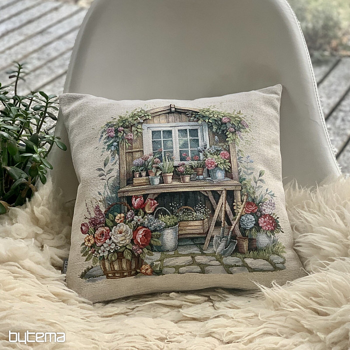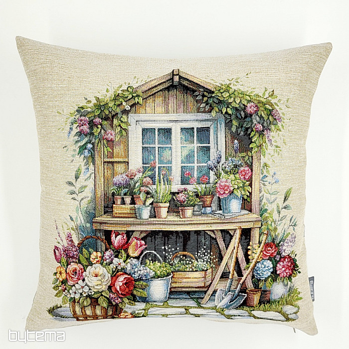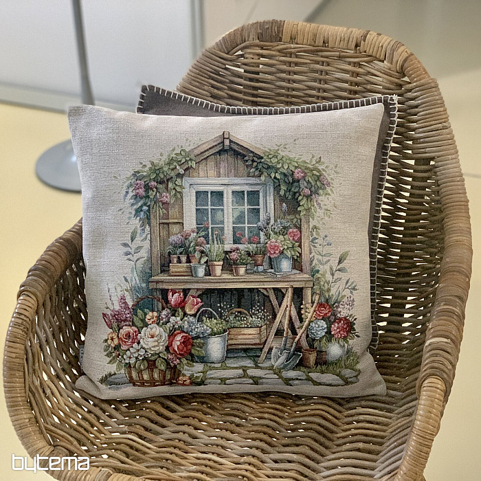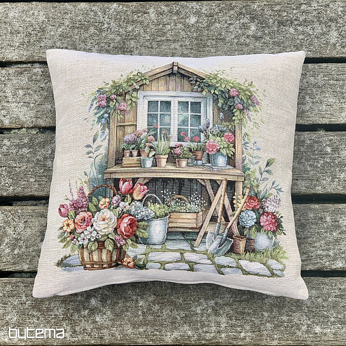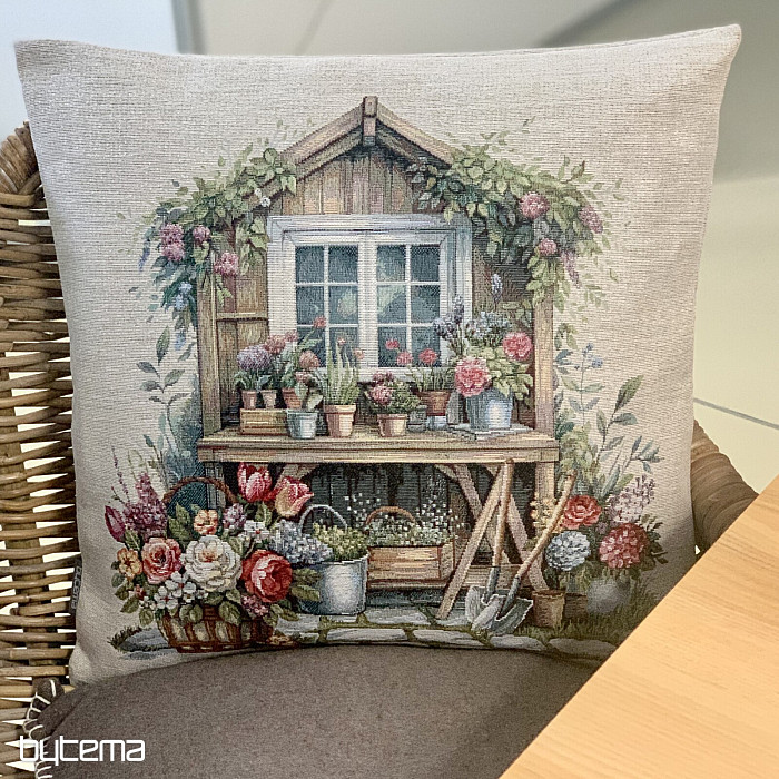Tapiserijska prevleka za vzglavnik z vrtno hišico, polno rož. Vzorec na prevleki diha spomladansko udobje in toplino.
