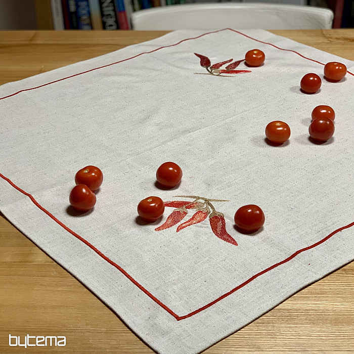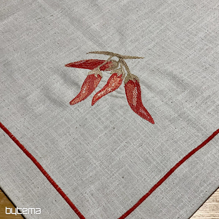 Vezen dekor rdečih pekočih paprik na čudovitem materialu z namigom lanu.