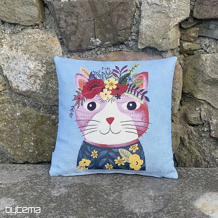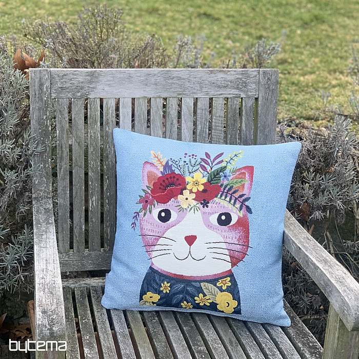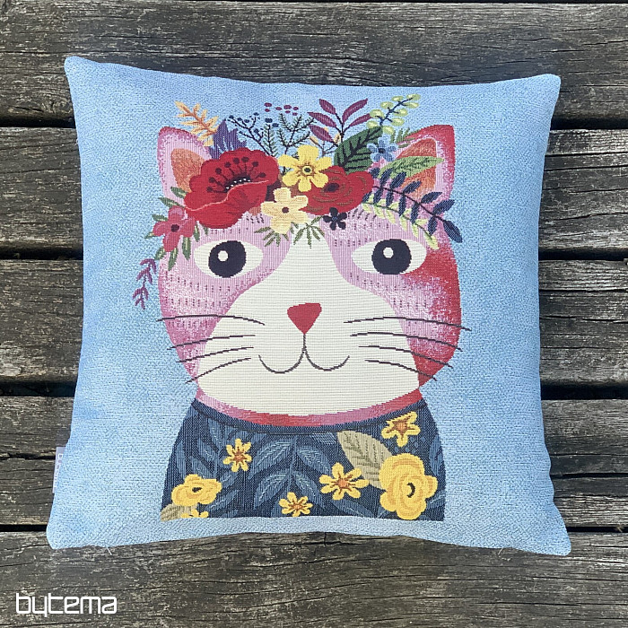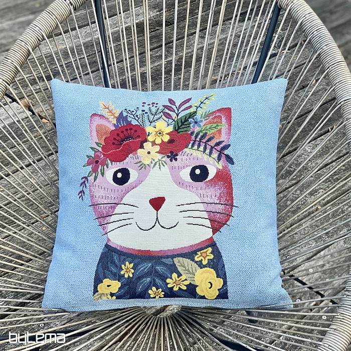Prevleka za tapiserijo z barvitim motivom mačke na modrem ozadju.