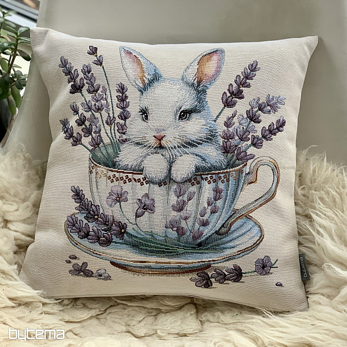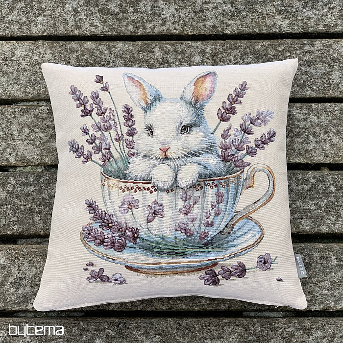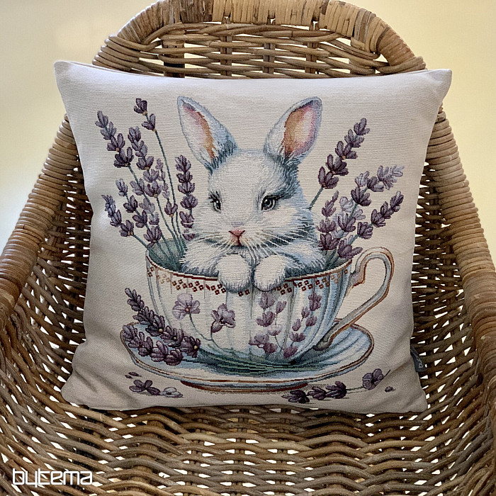 Tapiserijska prevleka za blazino z ljubkim zajčkom v porcelanastem servisu z dišečo sivko okoli. Čudovita in nežna dekoracija ne le za veliko noč.