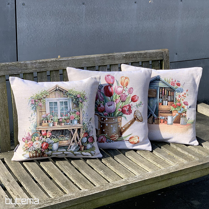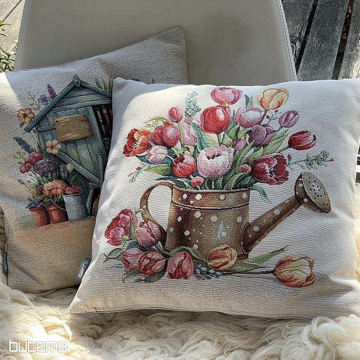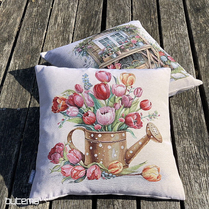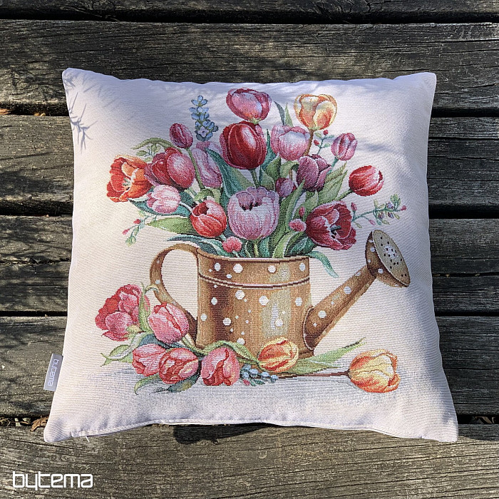 Tapiserijska prevleka za blazino s spomladanskim šopkom pisanih tulipanov v čajniku. Čudovita pomladna dekoracija v vašem domu.
