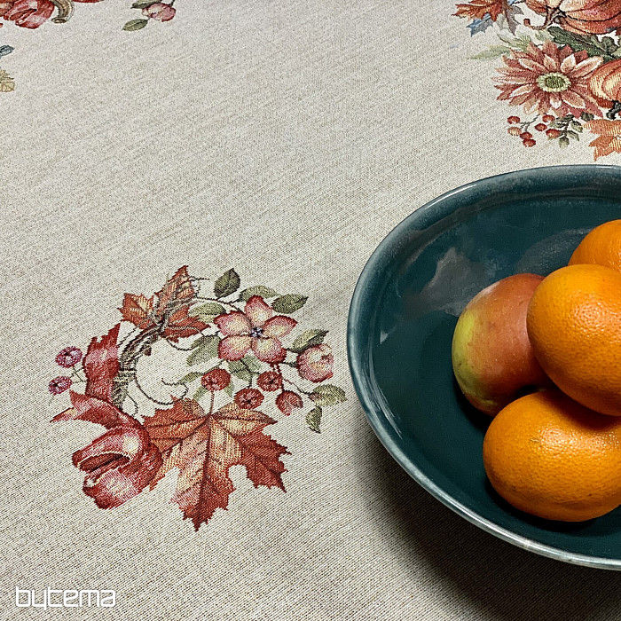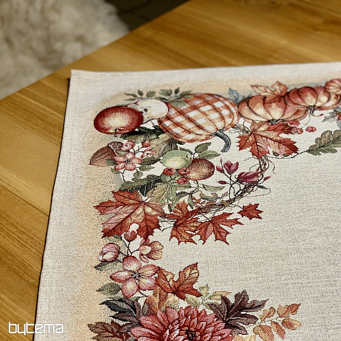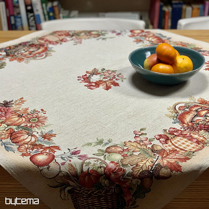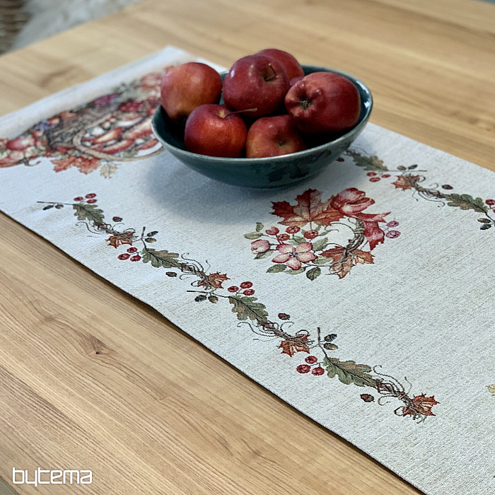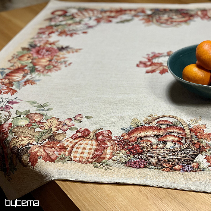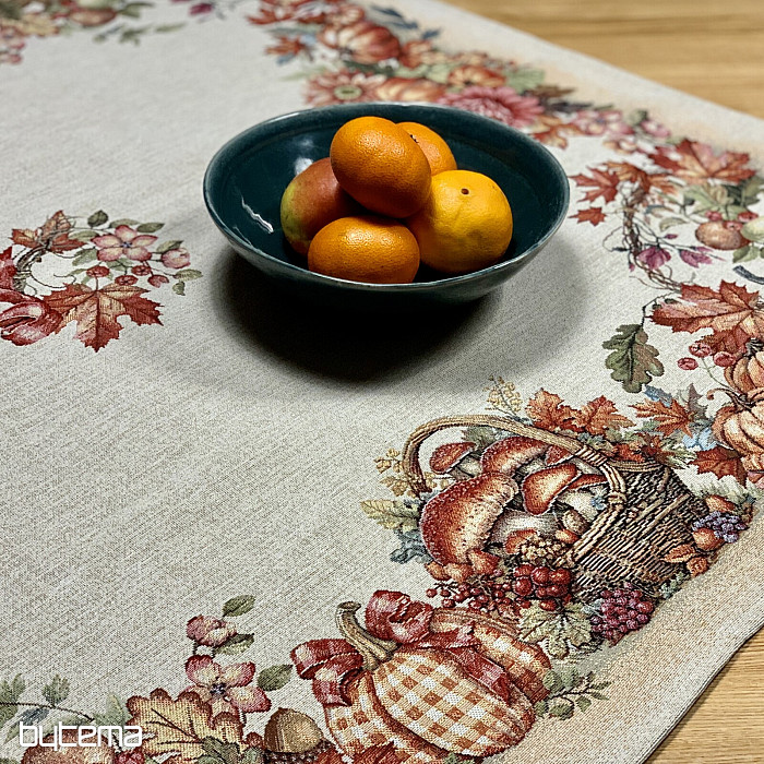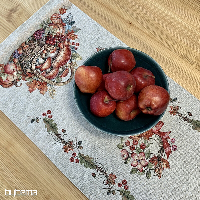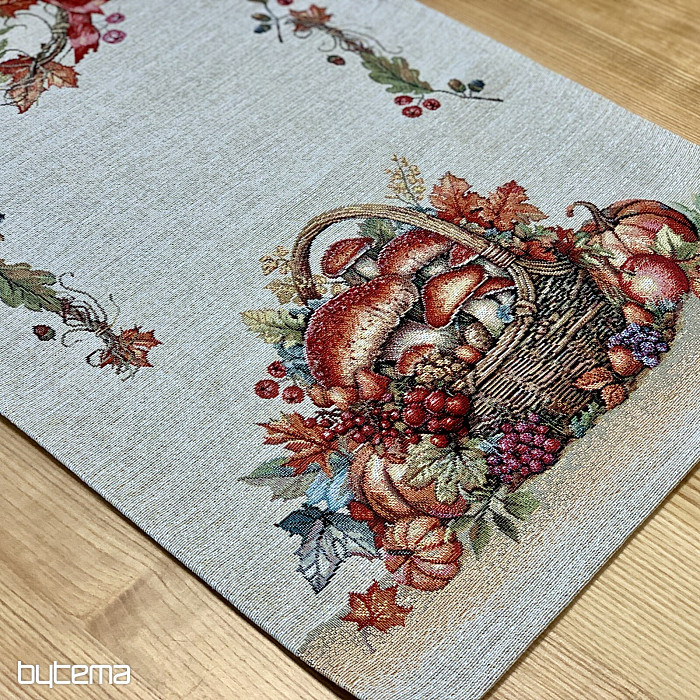 Tapiserijski prt in šal z motivom sadja in gob bosta ustvarila prijetno vzdušje.