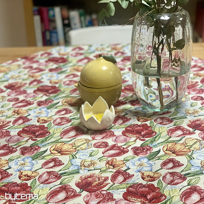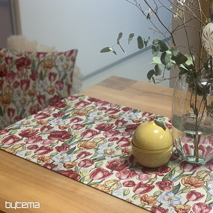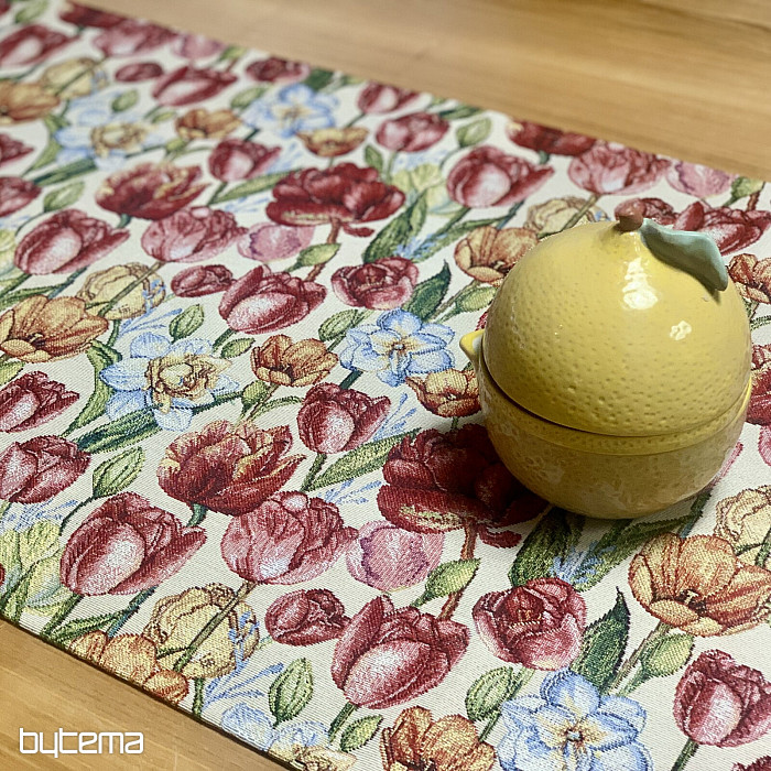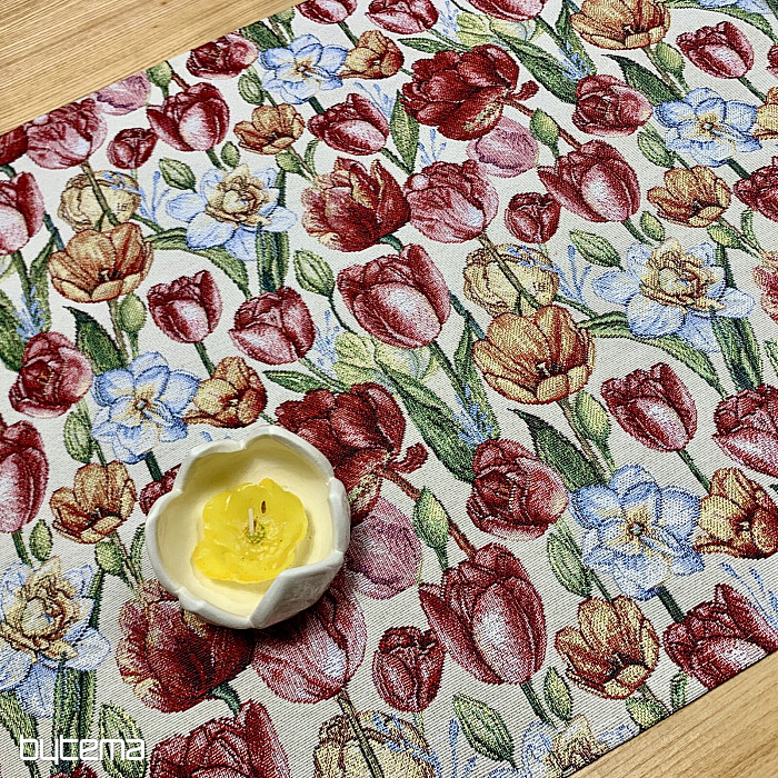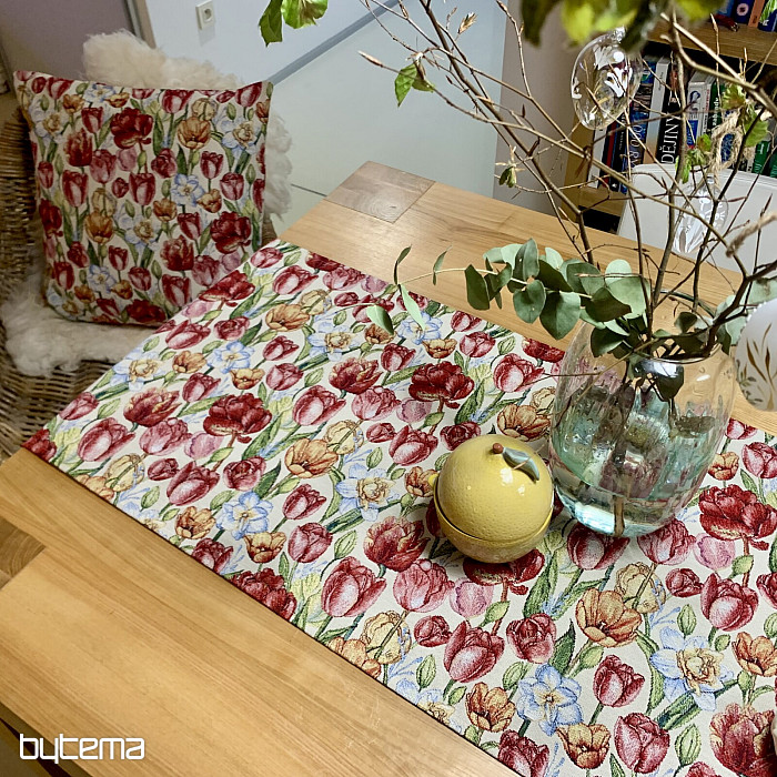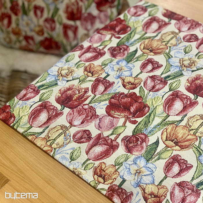 Čudovit tapiserijski prt in šal s spomladanskim cvetjem tulipanov in narcis. Čudovita pisana poplava cvetja in pomladi v vašem domu. Ponujamo tudi čudovite prevleke za blazine, ki se ujemajo z vzorcem.