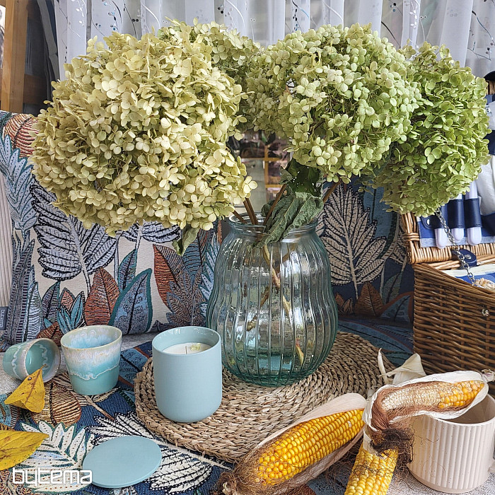Prozorna steklena vaza ALBANIA s sezonskim šopkom bo edinstven okras na vaši jedilni mizi ali v pergoli.