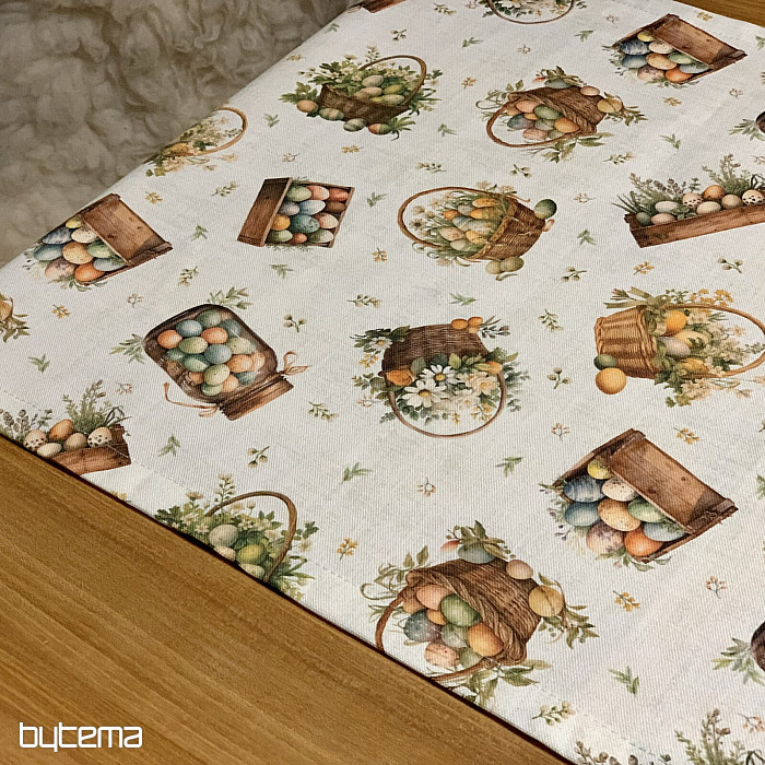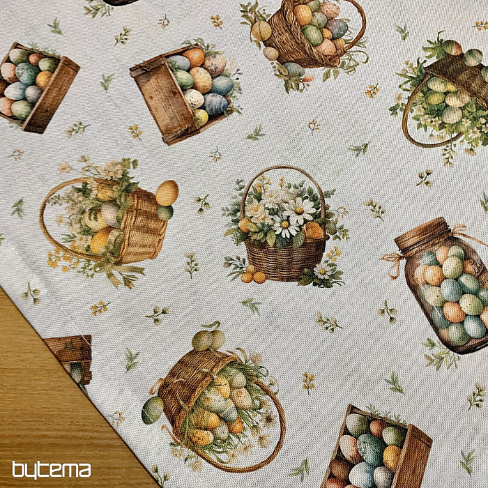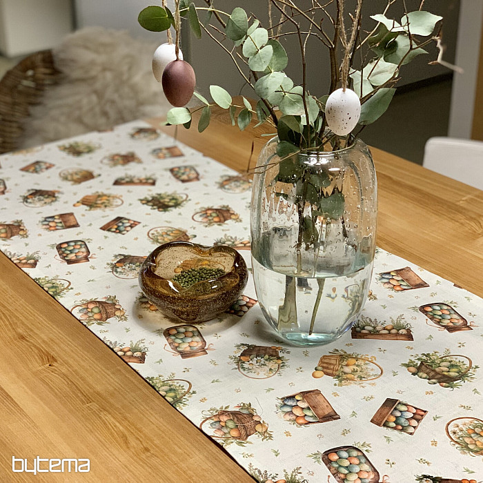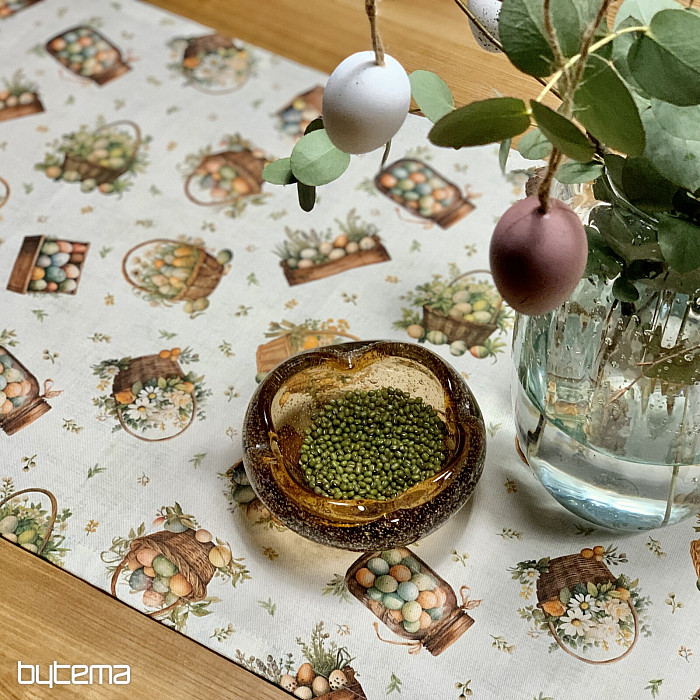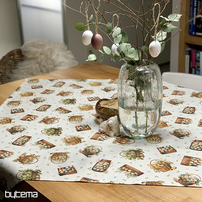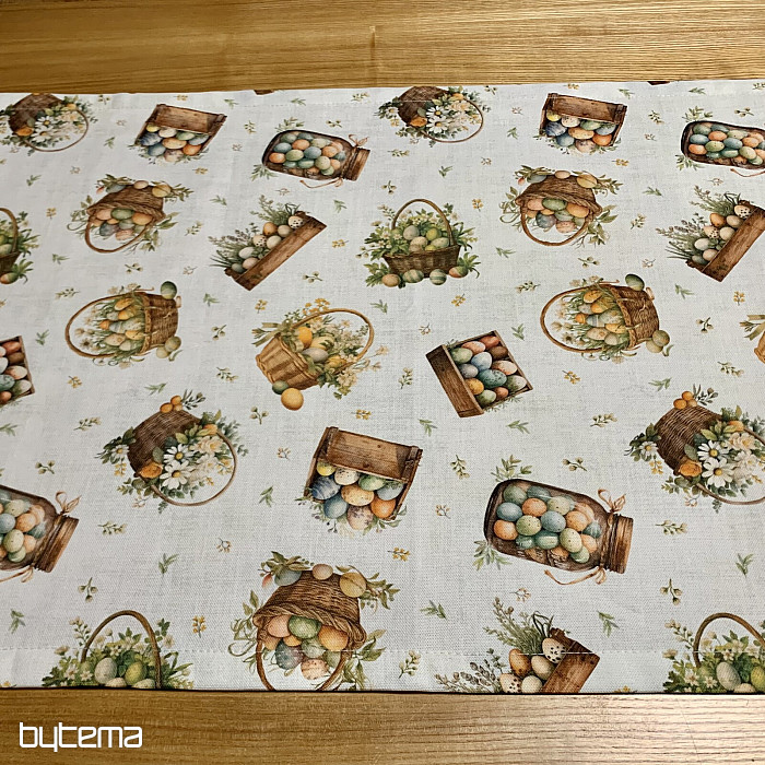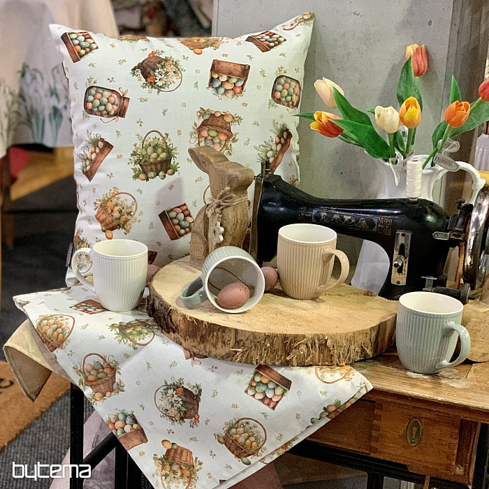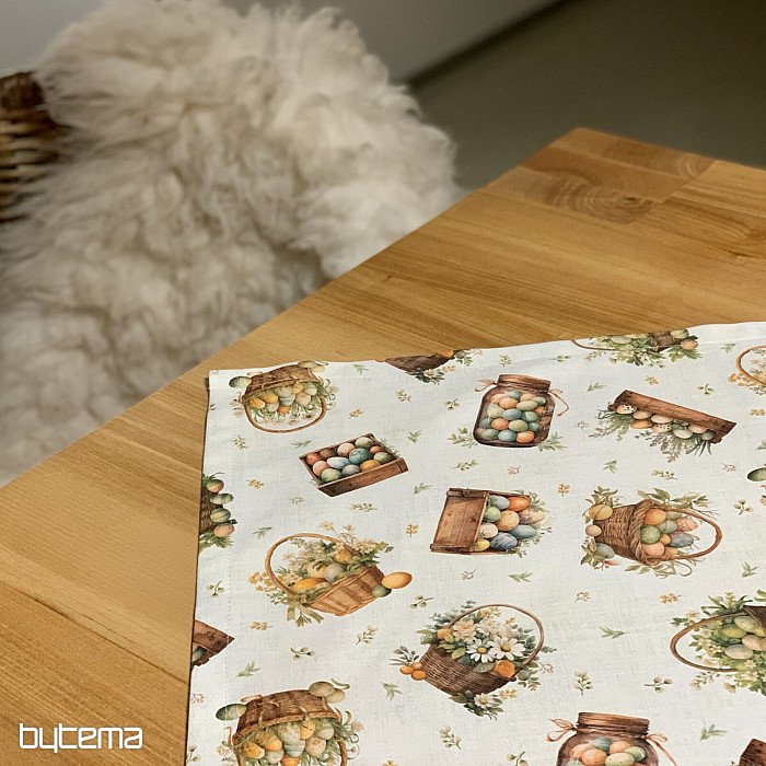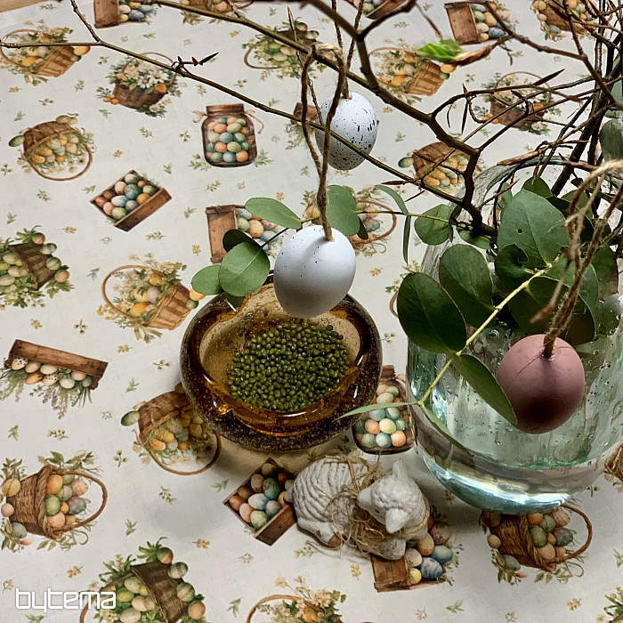 Velikonočni prt ali šal, poln velikonočnih jajc v različnih posodicah, bo lep okras v vašem domu.