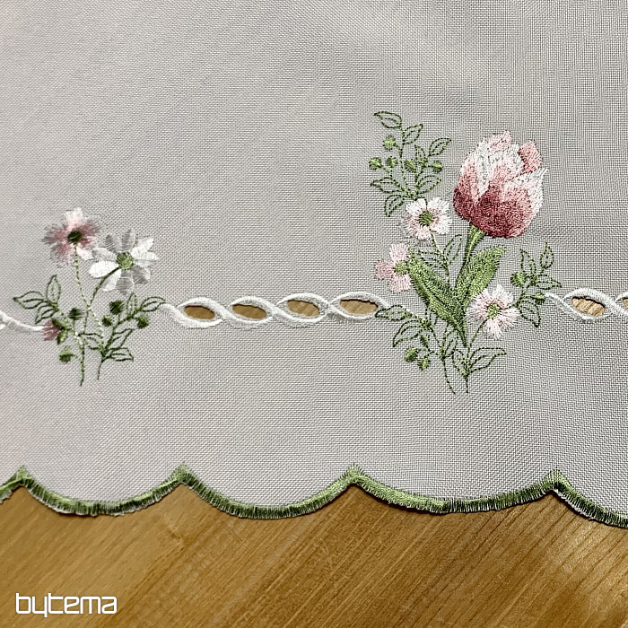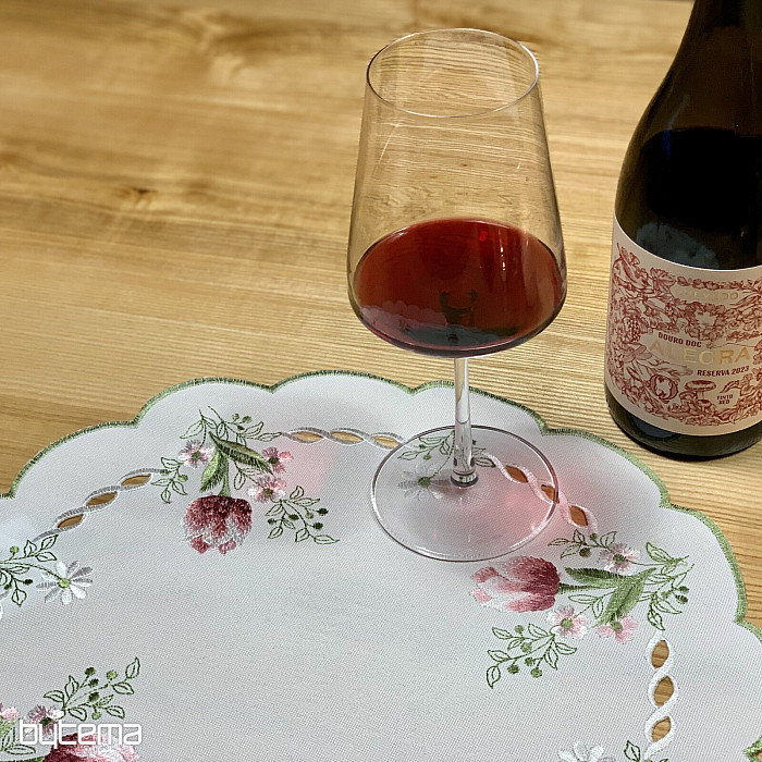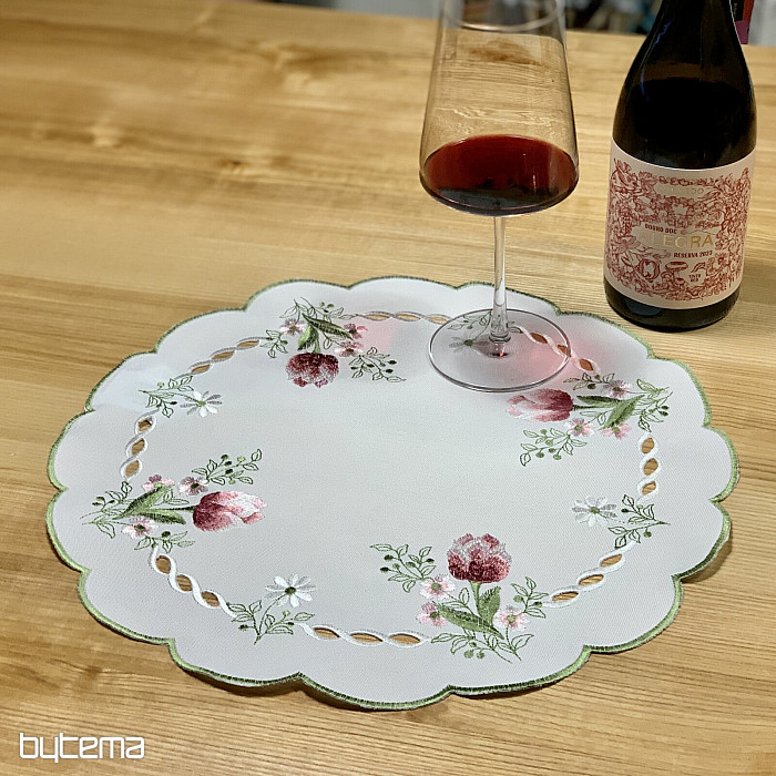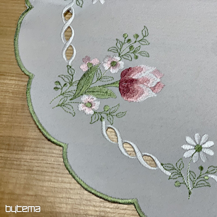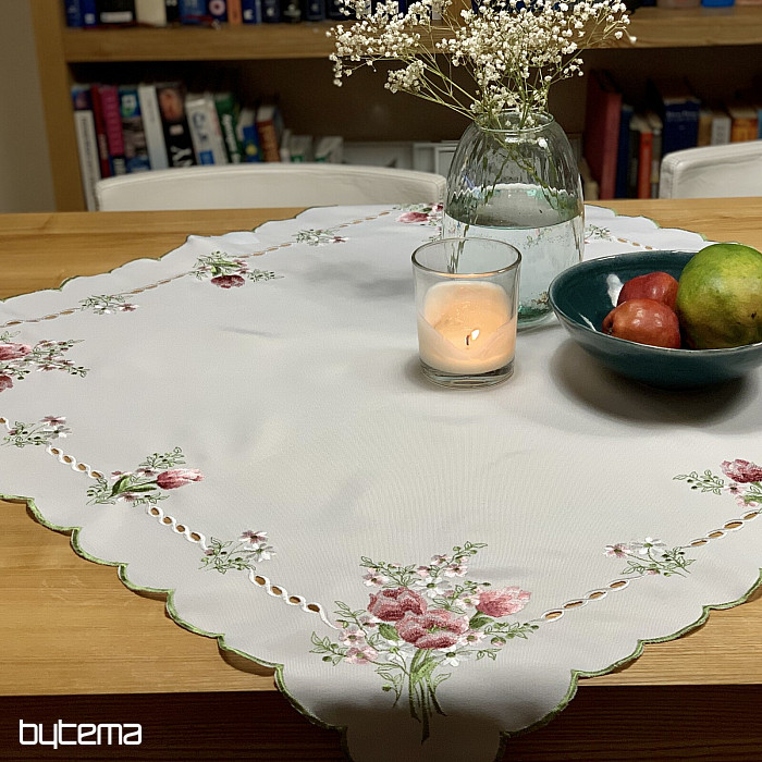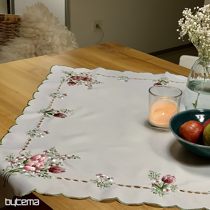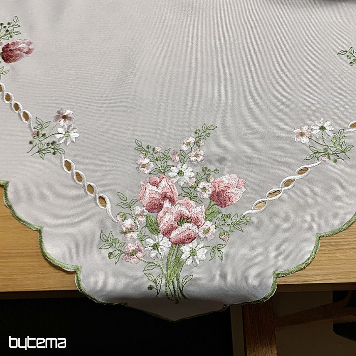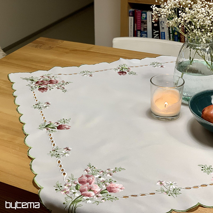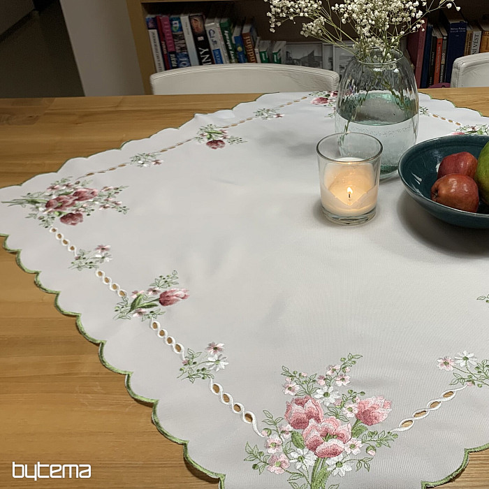 Čudovit vezen prt z motivom šopka roza tulipanov.