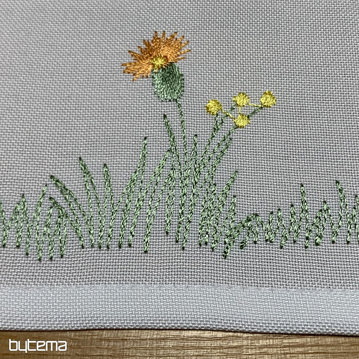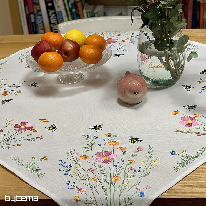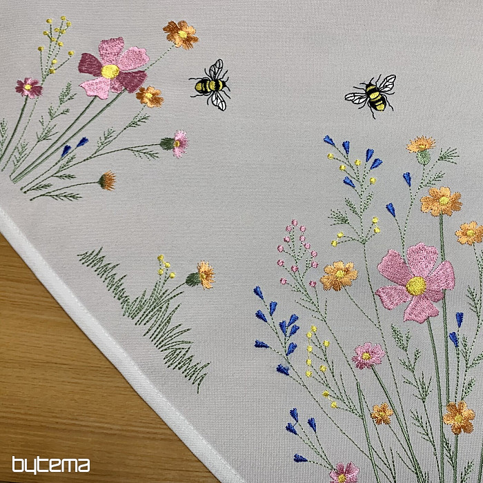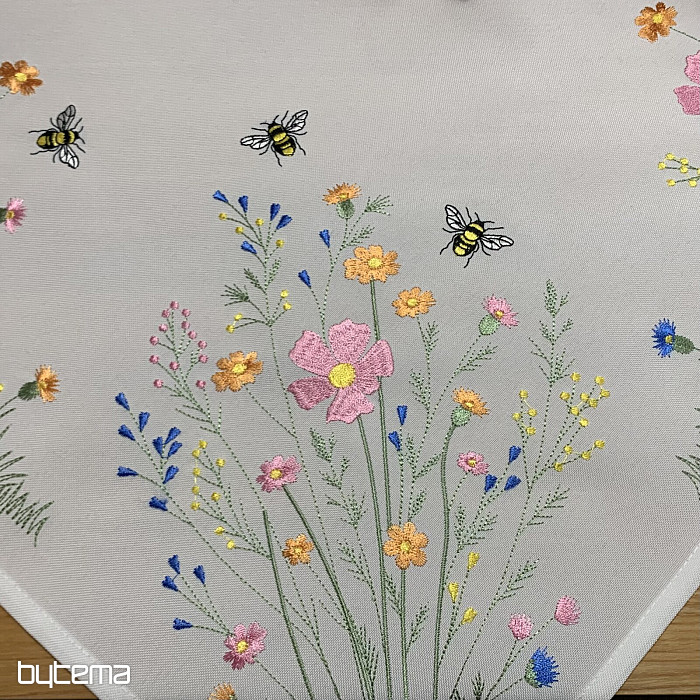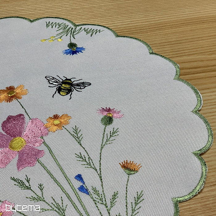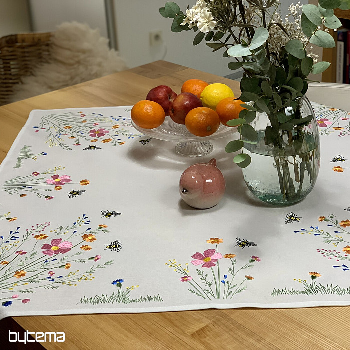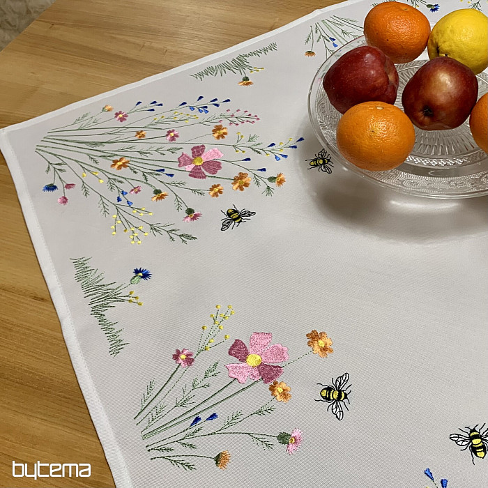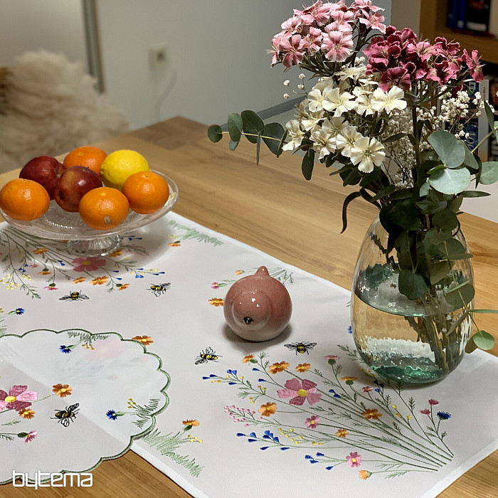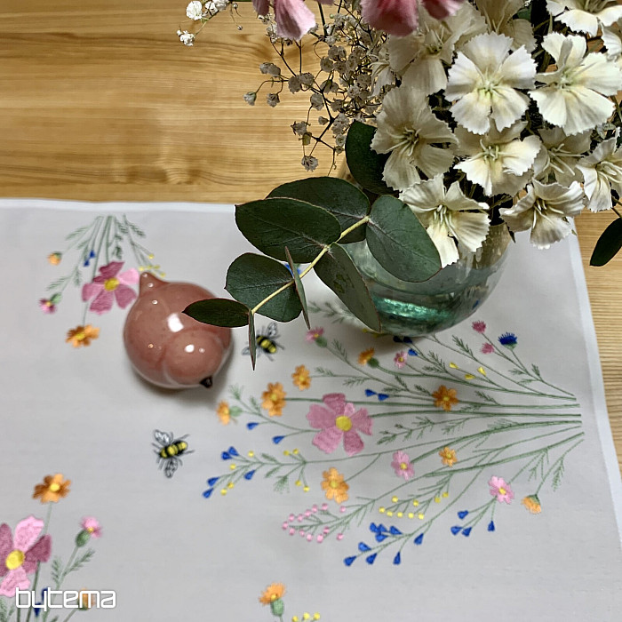 Nežen vezen prt in šal z motivom cvetočega travnika s čebelami.